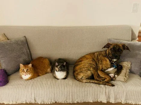 Our cats, Millie and Sylvie and our dog Cocoa having a rest on the couch