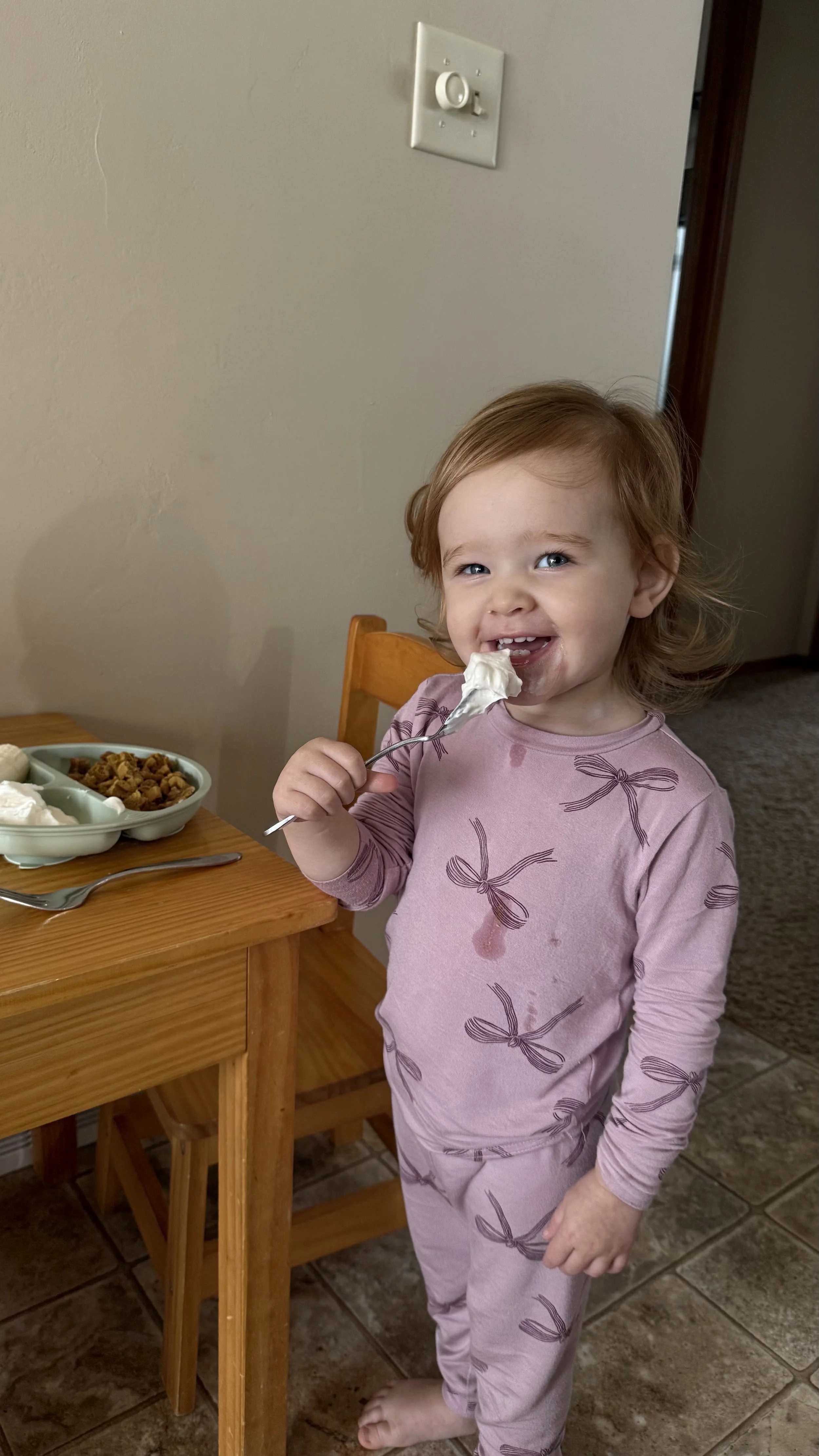 Charlotte enjoys some whipped cream with a side of waffle. Breakfast is her favorite meal.