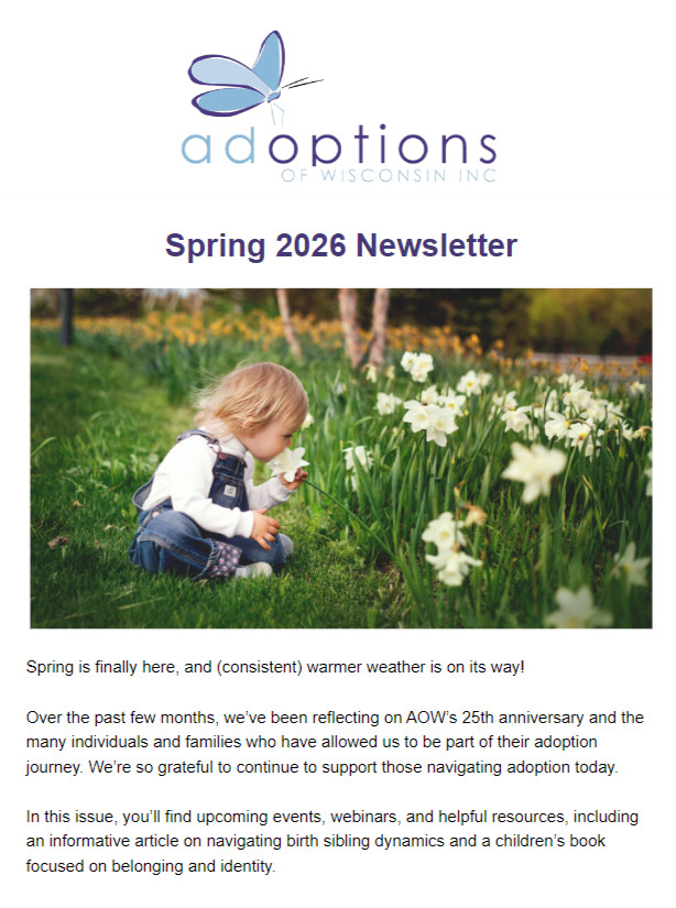 Check out upcoming events, agency updates, adoption-related news, and helpful resources! Plus, read what our social workers have to say about navigating open adoption relationships in our Social Worker Q&A section.
